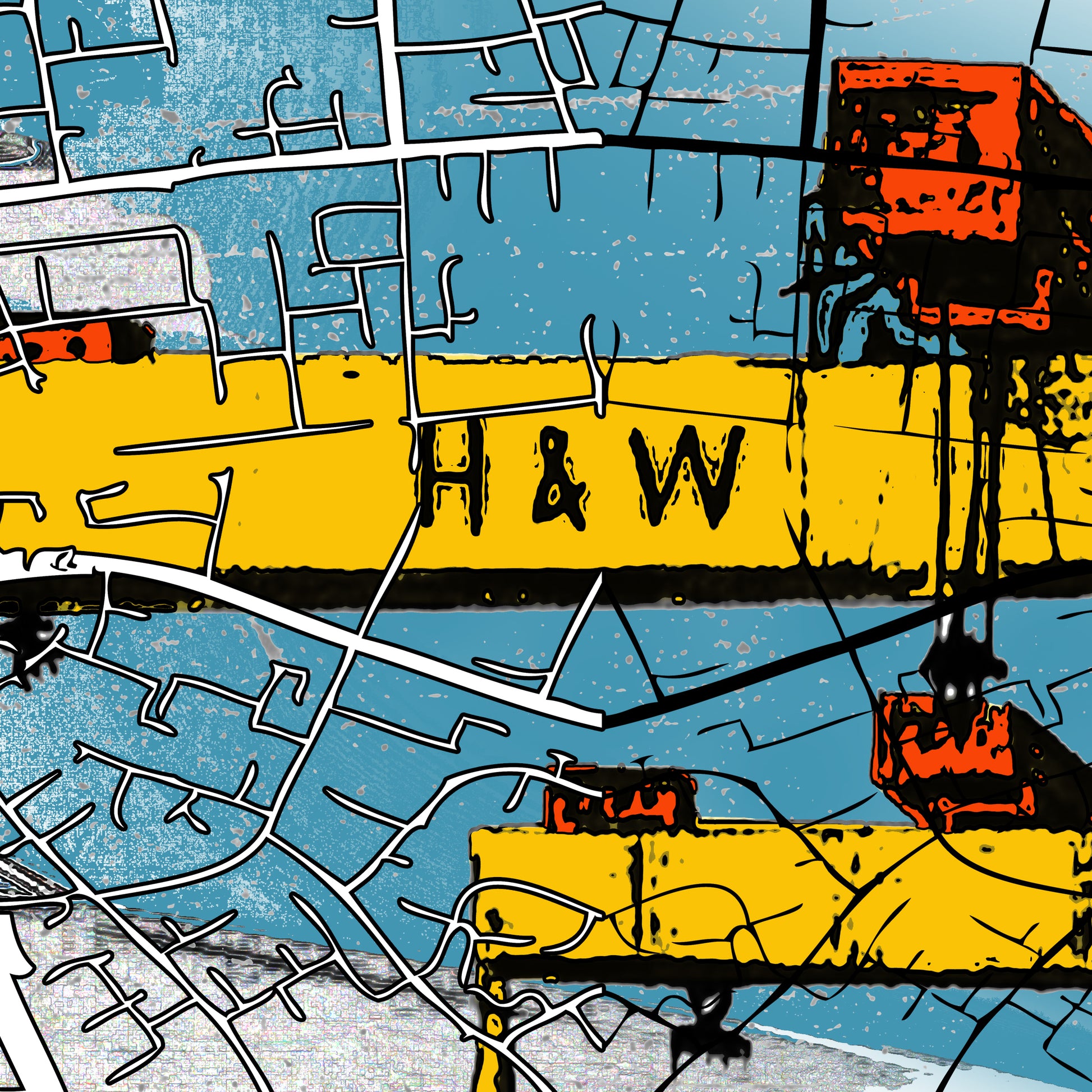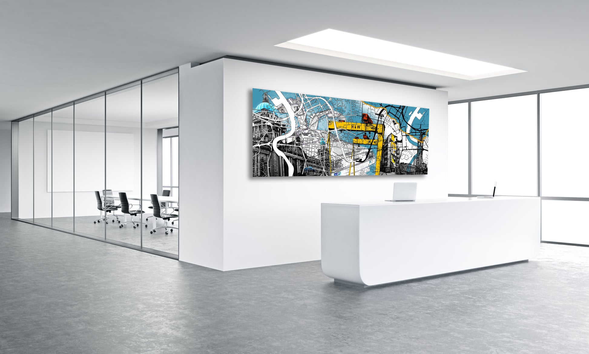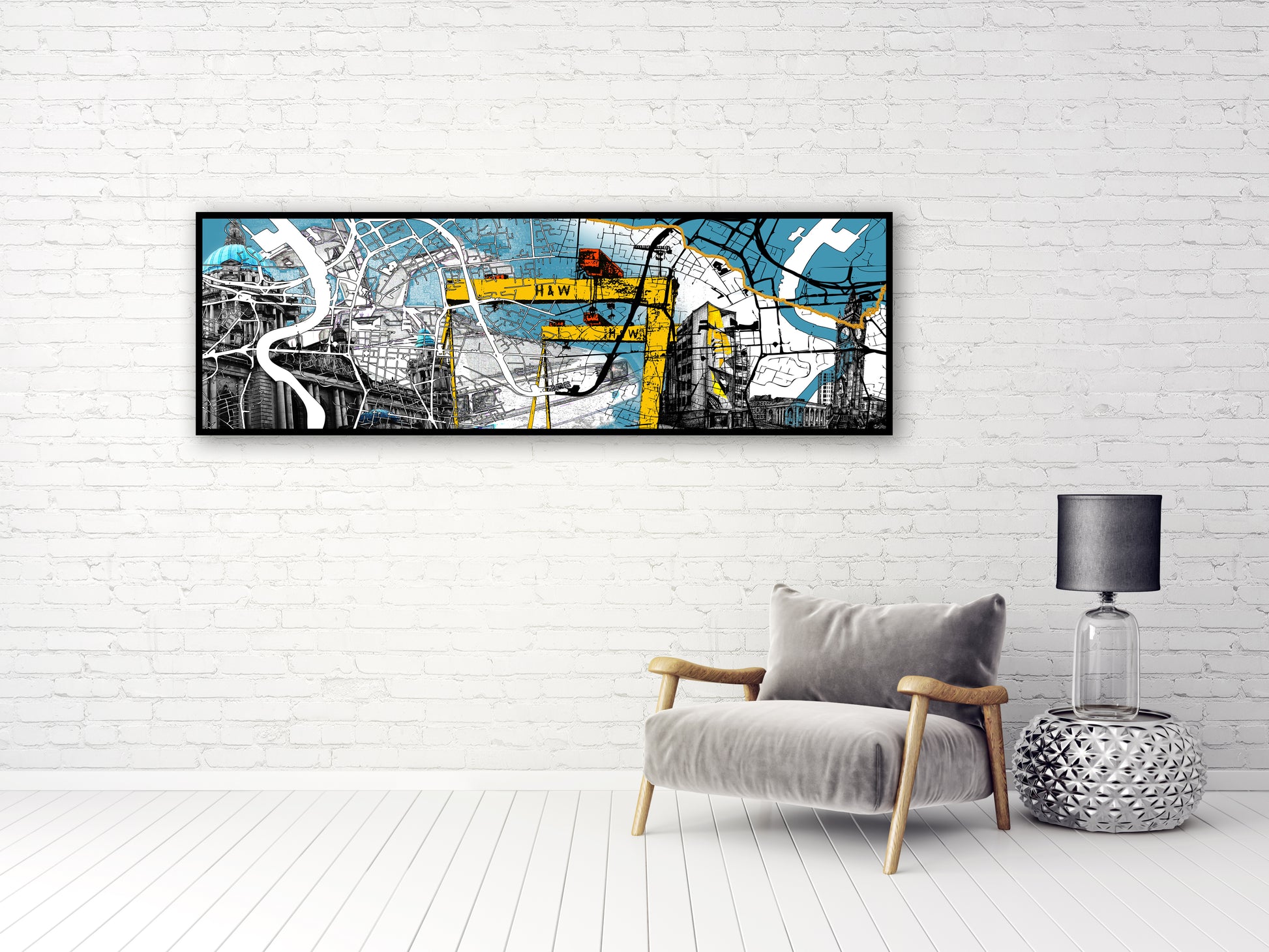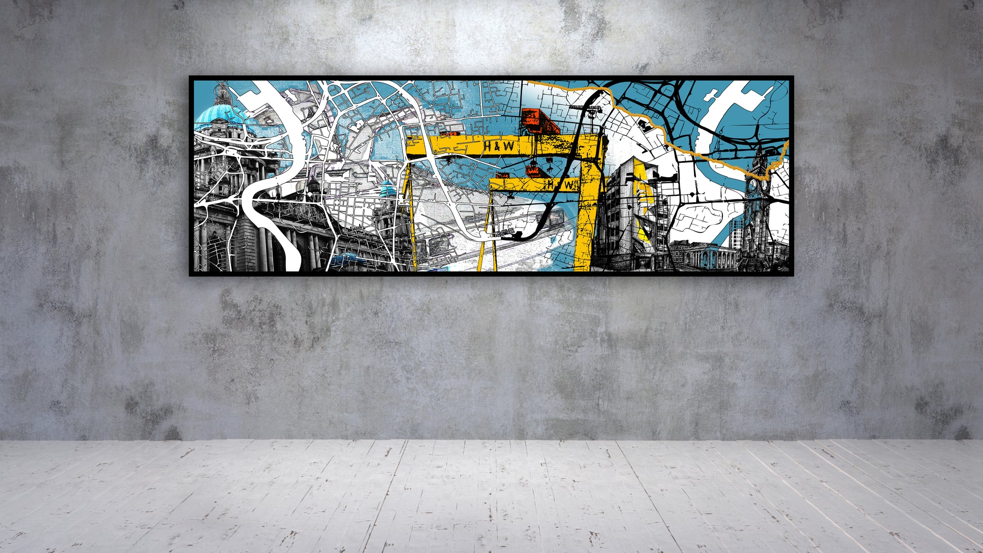 'Back To The Future' is an industrial piece that weaves a narrative through the streets of Belfast. These multi layered pieces weave a narrative through coastlines and ports, iconic structures and figures. They are Limited Editions of 95 on brushed Aluminium.