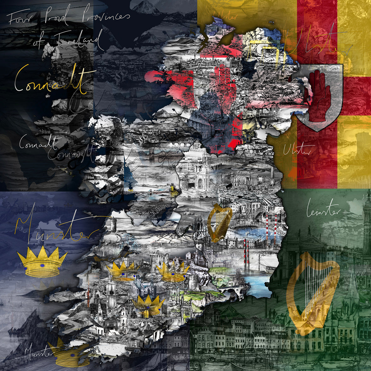 'Four Proud Provinces of Ireland' captures Ulster, Munster, Leinster and Connacht stunningly and is Stephen's latest addition to his growing body of Aluminium artwork. Capturing every corner of Ireland and nodding to her ancient and modern histories, this piece is bold and weaves a narrative through the four provinces that make up the island of Ireland.
