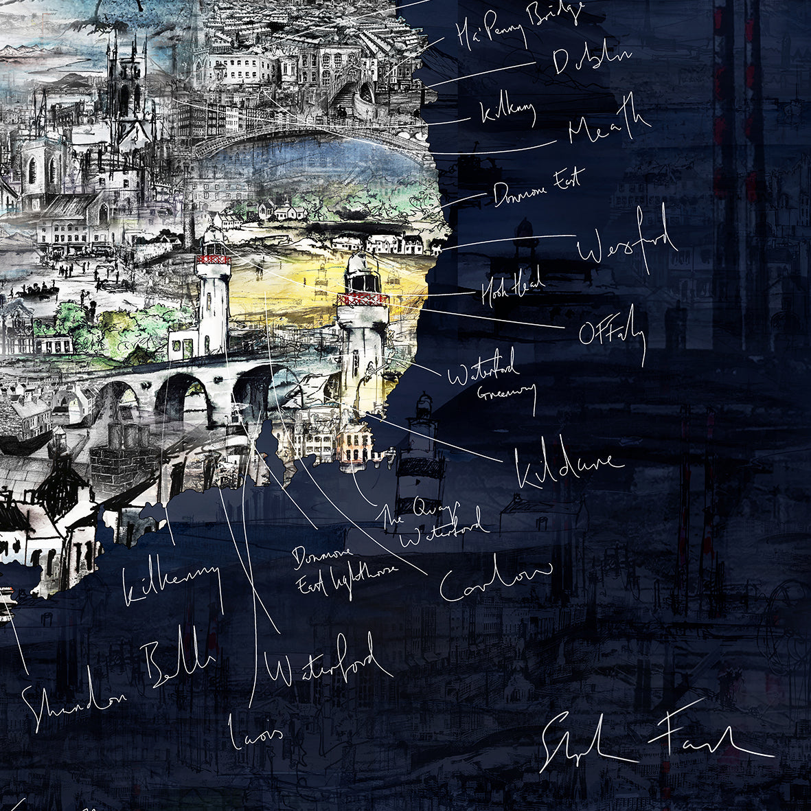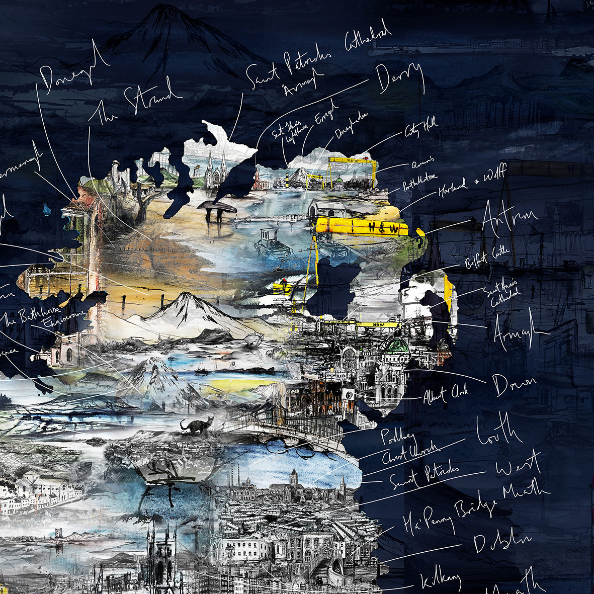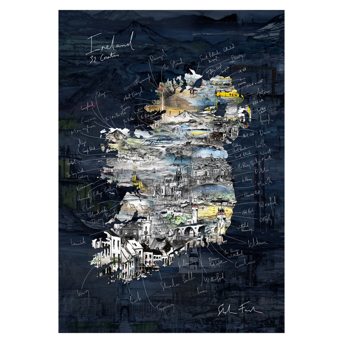 'Ireland, 32 Counties' is a moody and atmospheric piece with splashes of colour in it, capturing the essence of Ireland. It is a Limited Editions piece of /95 on Brushed Aluminium, these large pieces will light up and invigorate any space.