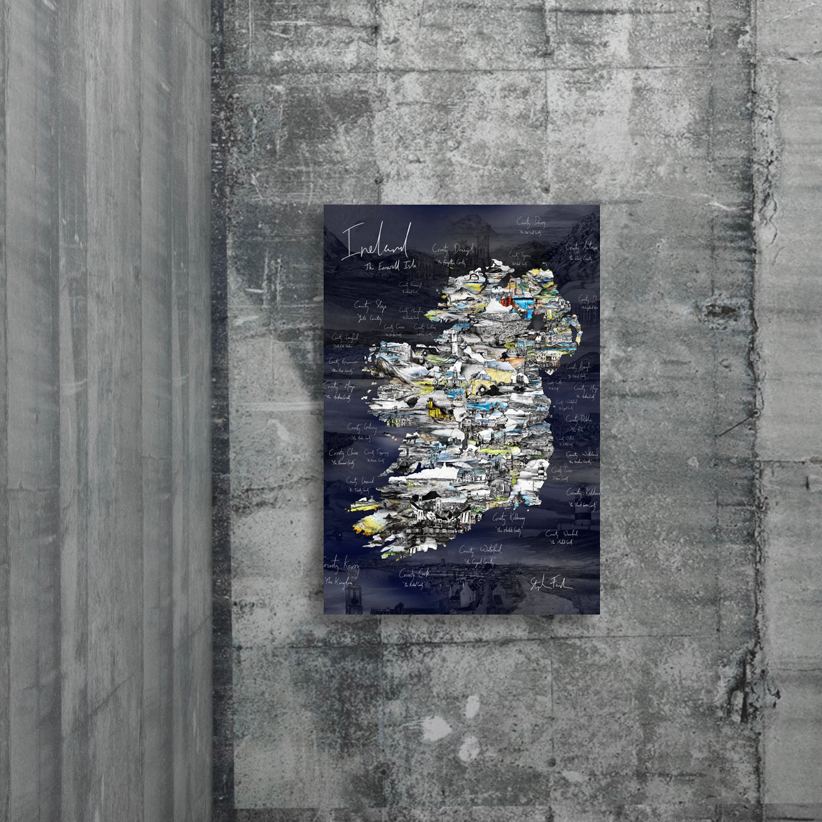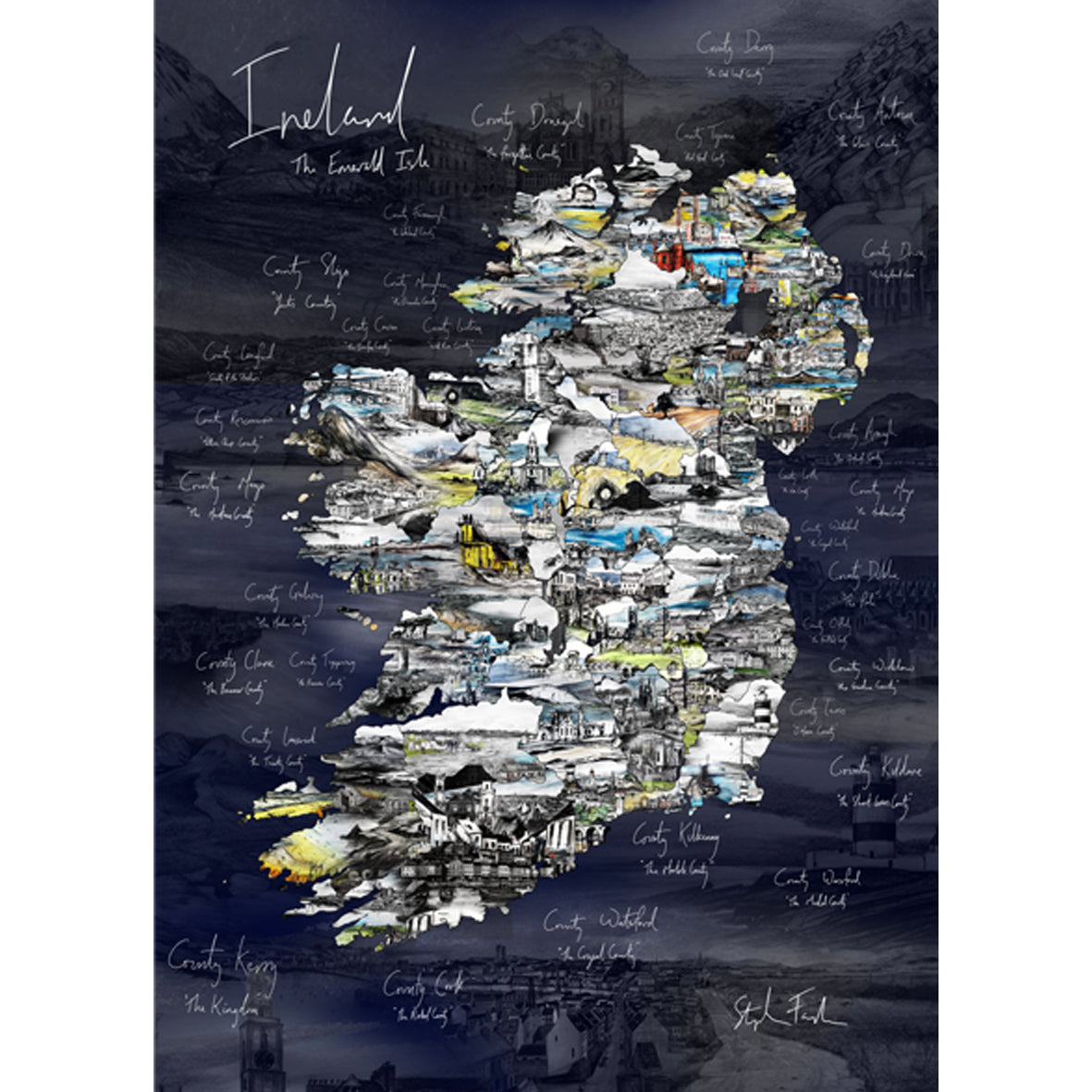 'The Emerald Isle' captures each of our 32 counties spanning Ulster, Munster, Leinster and Connacht and is Stephen's latest addition to his growing body of Aluminium artworks. Capturing every corner of Ireland and nodding to her ancient and modern histories, this piece is bold and weaves a narrative across the island of Ireland. Each county is available as an individual print (Galway being an example in the images), but are brought together in this all Ireland piece.