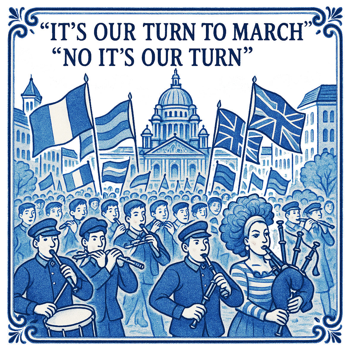 Our BELFAST delft designs take inspiration from 17th Century Dutch Delftware, itself inspired by centuries old Chinese Ming Dynasty porcelain. Each tile begins with a memory, a moment from childhood or recent history, and is brought to life with craft, imagination, and playful AI experimentation.