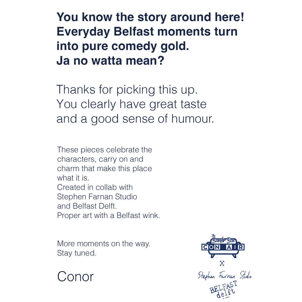 Fresh out of the kiln, this piece is part of a collaboration between CONAIR The Banterbox X Stephen Farnan Studio / BELFAST delft. Each design celebrates the characters, carry-on, and charm that make this place what it is. Lifted straight from one of Conor’s classic skits, these wee pieces of art deliver proper Belfast wit every time you look at them.