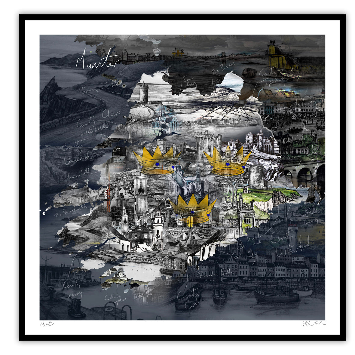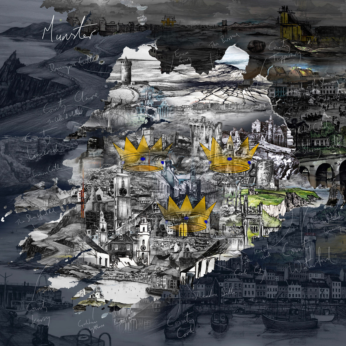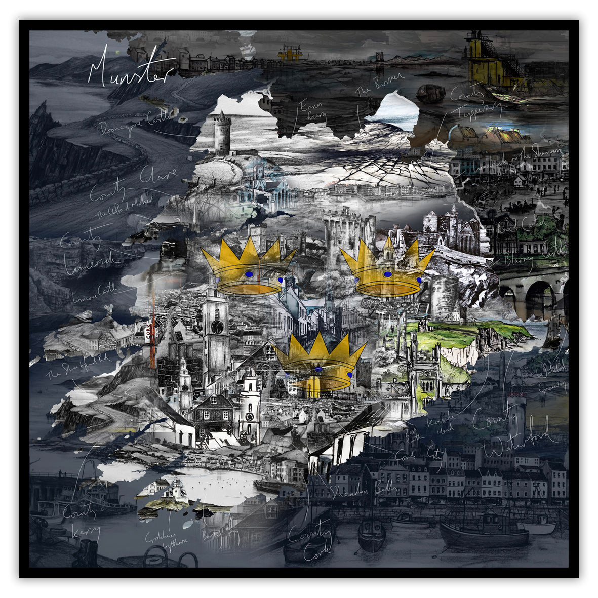 'Munster' captures the southern province in stunningly glory and is amongst Stephen's latest additions to his growing body of Aluminium artwork. Capturing every corner of the Kingdom and nodding to her ancient and modern histories, this piece is bold and weaves a narrative through munster's history.