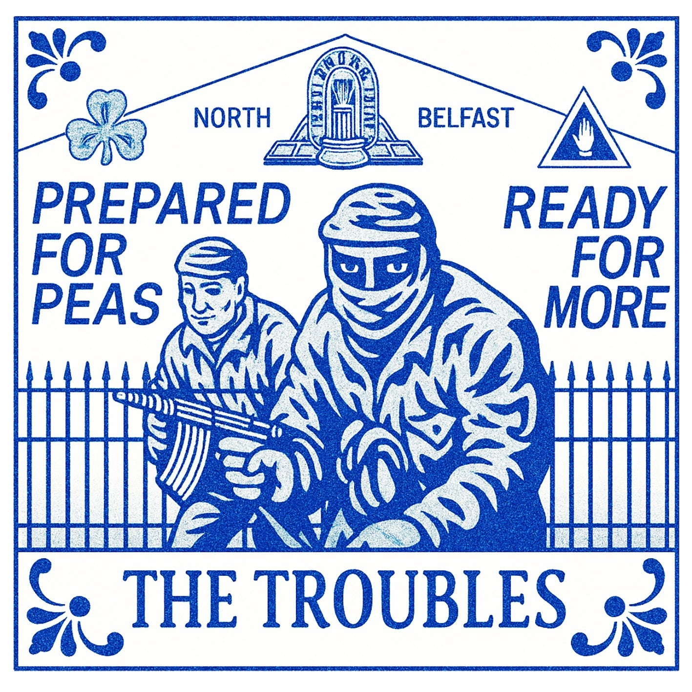 Our BELFAST delft designs take inspiration from 17th Century Dutch Delftware, itself inspired by centuries old Chinese Ming Dynasty porcelain. Each tile begins with a memory, a moment from childhood or recent history, and is brought to life with craft, imagination, and playful AI experimentation.