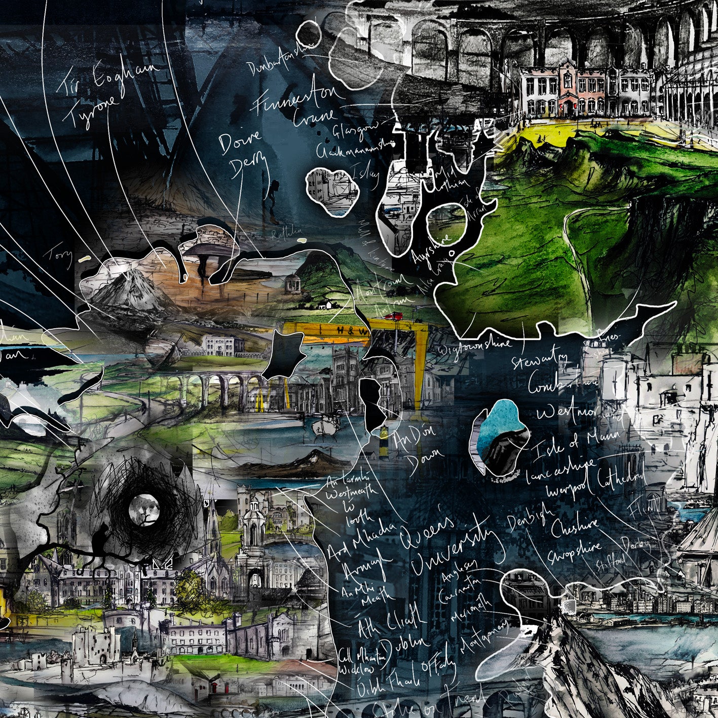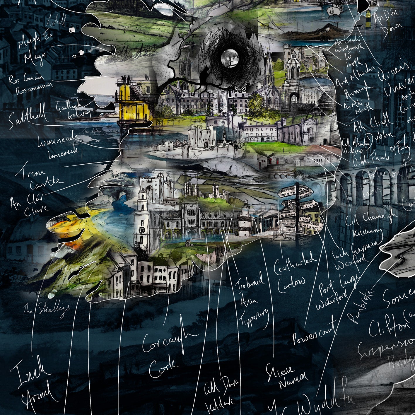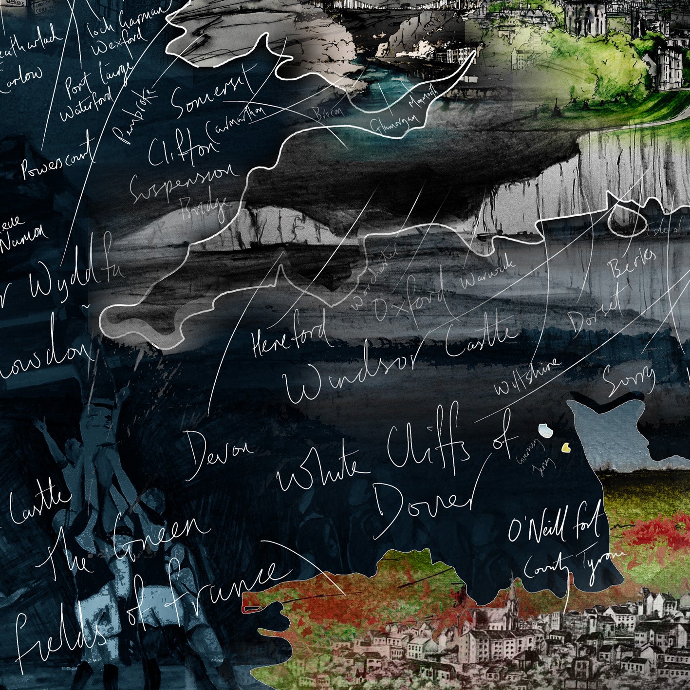 The sub-title — is a lyrical blend of Irish and English, "Tír na Ríthe is na Queens" literally meaning “Land of Kings and Queens” — gesturing to the layered and often complex history shared by these islands. From the mythical Hill of Tara to the White Cliffs of Dover, and even the green fields of France, this piece captures every county in Ireland, Scotland, England, and Wales. Each corner is acknowledged, forming a poetic cartography that celebrates both distinct identities and shared heritage.