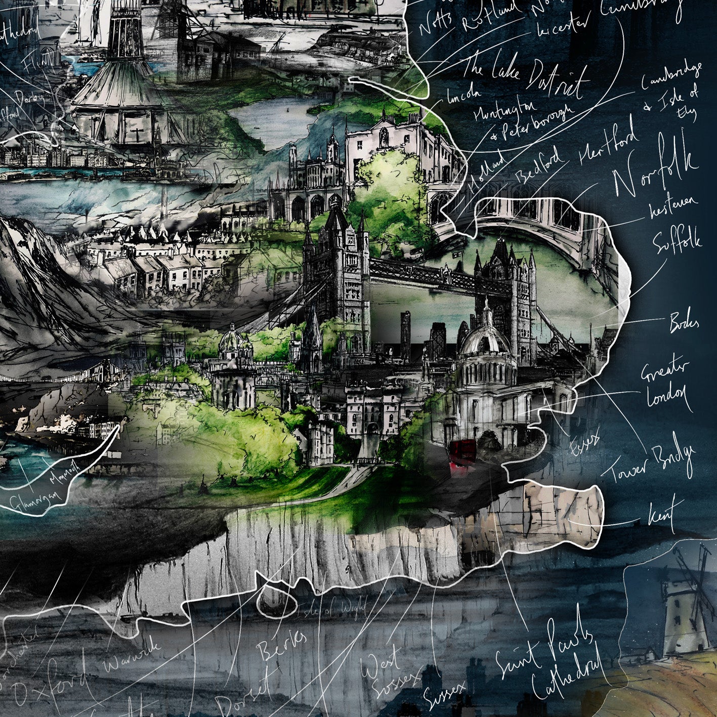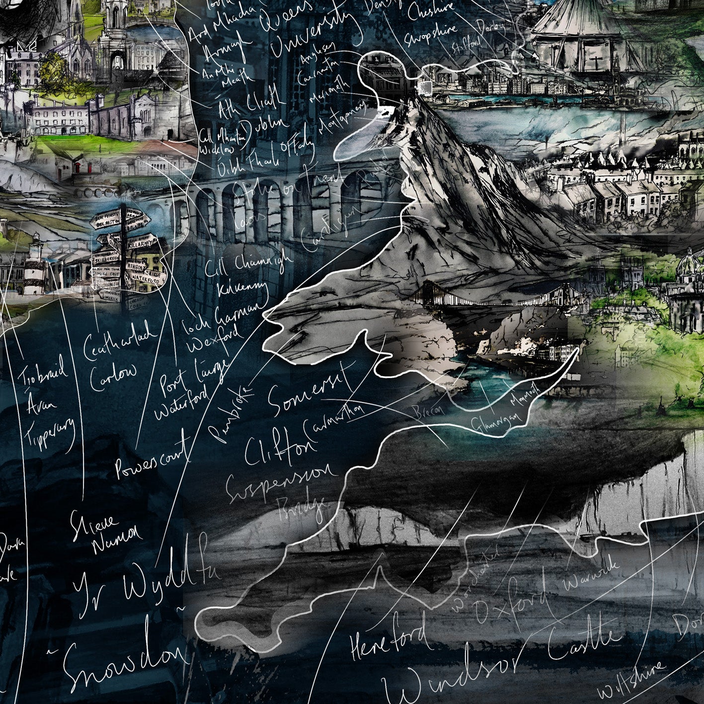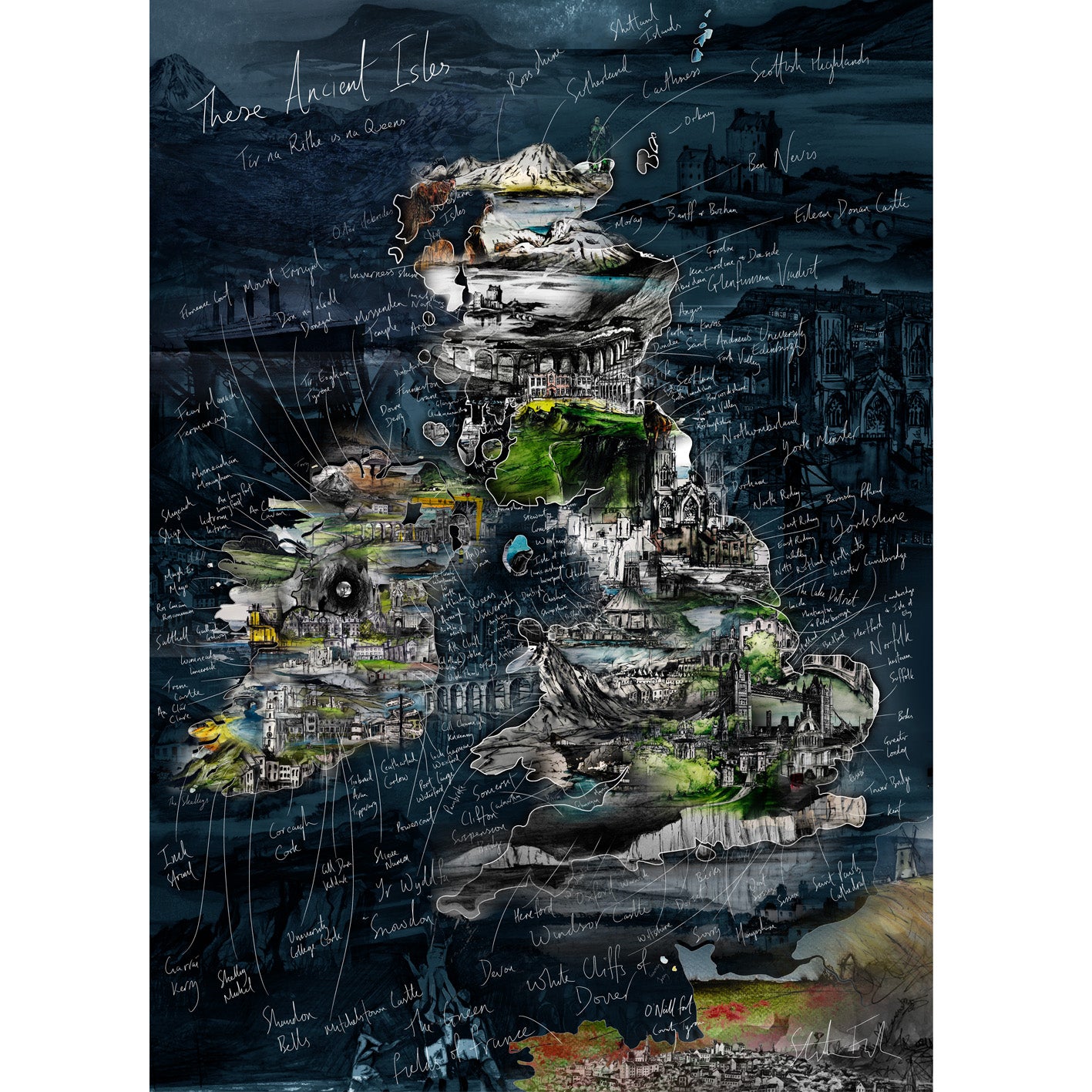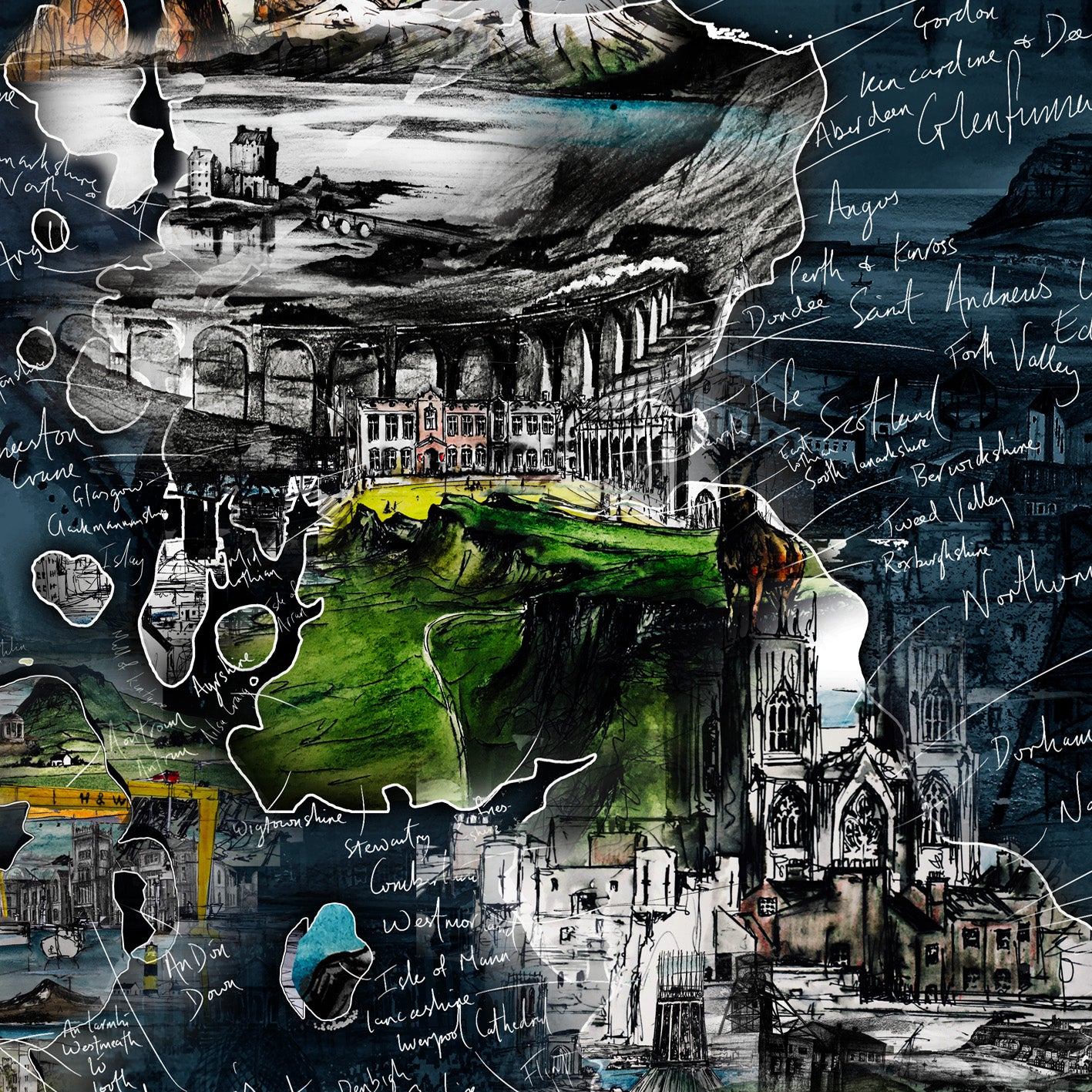 The sub-title — is a lyrical blend of Irish and English, "Tír na Ríthe is na Queens" literally meaning “Land of Kings and Queens” — gesturing to the layered and often complex history shared by these islands. From the mythical Hill of Tara to the White Cliffs of Dover, and even the green fields of France, this piece captures every county in Ireland, Scotland, England, and Wales. Each corner is acknowledged, forming a poetic cartography that celebrates both distinct identities and shared heritage.